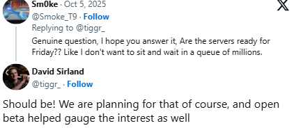 《战地6》首席制作人大卫·瑟兰近日在推特回复玩家询问时确认,周五首发当日服务器"应该"准备就绪。他解释道团队致力于提供流畅体验,开放测试帮助量化了玩家兴趣度,使团队能精准预测流量峰值。