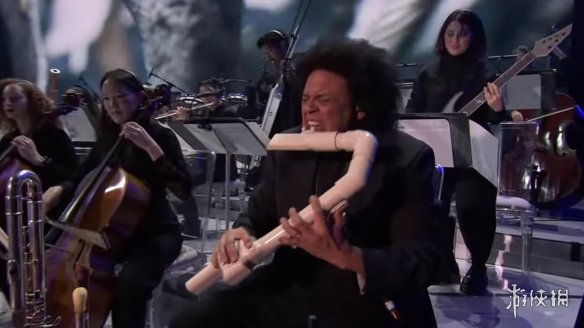 2025年自然也不例外。为了迎接这位顶流,TGA官方甚至在颁奖典礼预热阶段,专门在其社交媒体页面上发布了一段属于他的官宣视频。而在正式演出的交响乐环节中,他的表现没有辜负粉丝的期待——先是在《死亡搁浅2》的编曲中贡献了精彩的笛声,随后在演奏《光与影:33号远征队》的乐章时,他掏出了一把看似由PVC水管临时拼凑的新乐器,将现场的节目效果直接拉满。