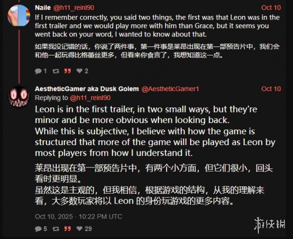 "里昂在首支预告片中通过两种微妙的方式出现,不过这些线索需要等到事后回顾时才会更加明显。虽然这属于个人解读,但基于我了解到的游戏架构,大多数玩家在游戏过程中将会有相当长的篇章是以里昂为主角进行体验的。"