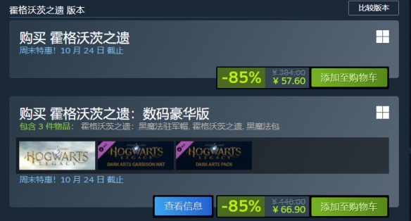 备受好评的开放世界大作《 霍格沃茨之遗 》在Steam商店迎来新史低促销,原价384元,现1.5折仅需57.6元;豪华版原价446元,现66.9元。优惠活动截止到10月24日,感兴趣的玩家记得抓紧时间购买。