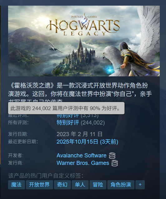 截稿之前,本作在Steam平台全部评测为“特别好评”,244002条用户评测中,好评率高达90%。
