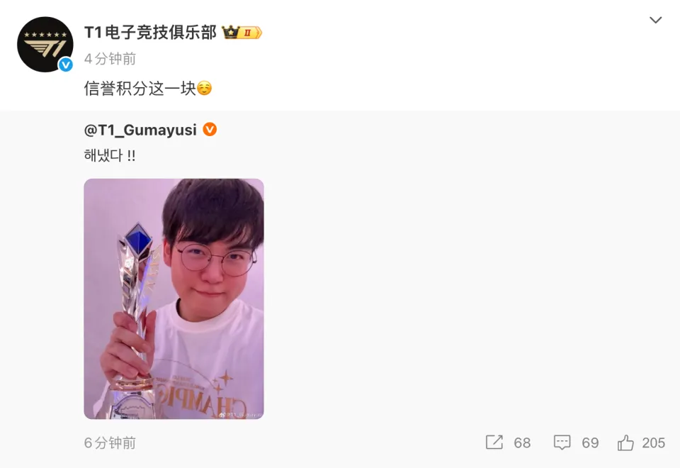 值得一提的是,Gumayusi曾在2023年的一次直播中自信地表示,自己有信心在25岁时达到巅峰,并拿下三座S赛冠军。如今,他的话得到了验证。他在中文社交媒体上晒出了自己与FMVP奖杯的合照,并用韩语写道:“我做到了!!”T1官方也迅速转发并评论道:“信誉积分这一块。”