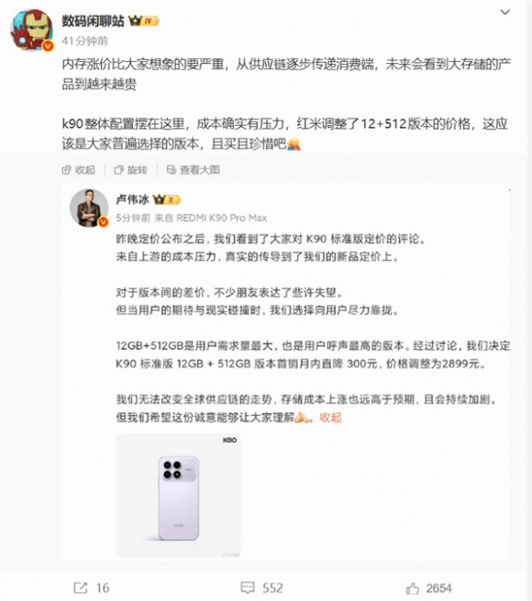 上个月,小米集团卢伟冰也在微博上回应了这一趋势:“我们无法改变全球供应链的走势,存储成本上涨也远高于预期,且会持续加剧。”