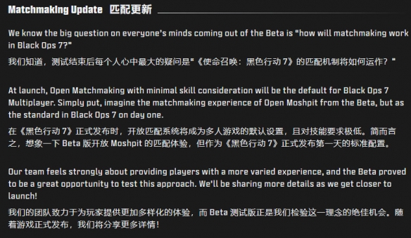 更受关注的是,动视确认在《黑色行动7》中,“开放匹配,且几乎不考虑玩家技能”将成为多人模式的默认设置,这实质上意味着SBMM系统被基本放弃。