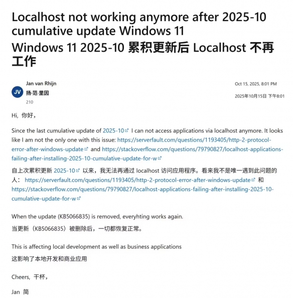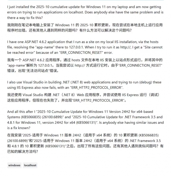 据科技媒体bleepingcomputer 10月16日报道,微软Windows 11的九月可选更新(KB5065789)与十月累积更新(KB5066835)存在一项关键BUG,会导致开发者和应用程序无法通过HTTP/2协议连接至本地主机(localhost)。