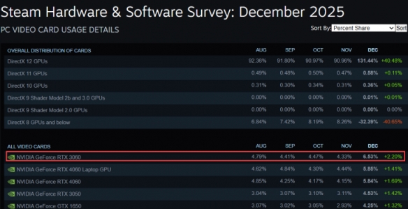 作为面向大众消费市场的60系显卡主力,NVIDIA需为合作伙伴提供稳定替代方案。RTX 3060自2021年发布、2024年停产后仍展现强劲生命力——据最新Steam硬件统计,其仍以6.53%的占有率稳居全球显卡份额榜首。该显卡提供12GB和8GB两种显存版本,目前NVIDIA正与AIC合作伙伴确认是否复产双版本及具体时间节点。