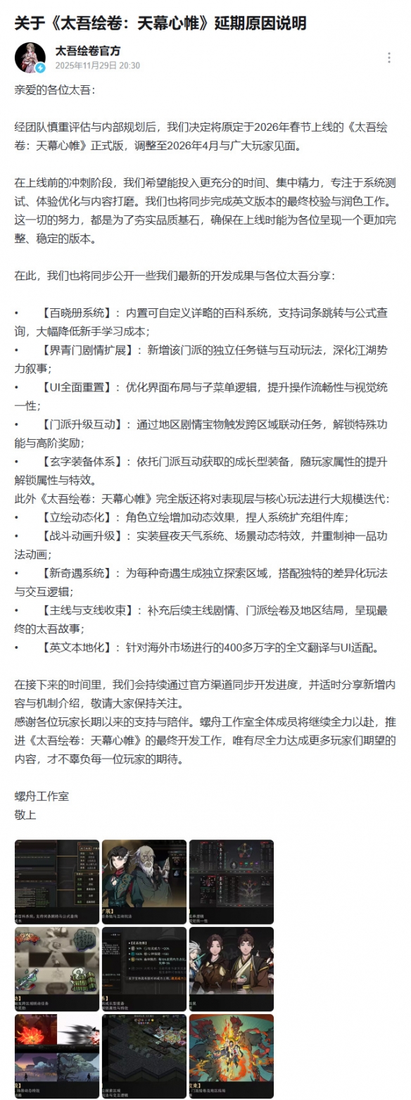 《太吾绘卷》开发组宣布,原定2026年春节上线的《天幕心帷》正式版将延期至同年4月发售。官方解释此举是为进一步提升游戏品质,预留更多时间进行系统测试、体验优化和英文版本校对。