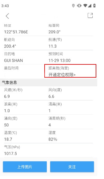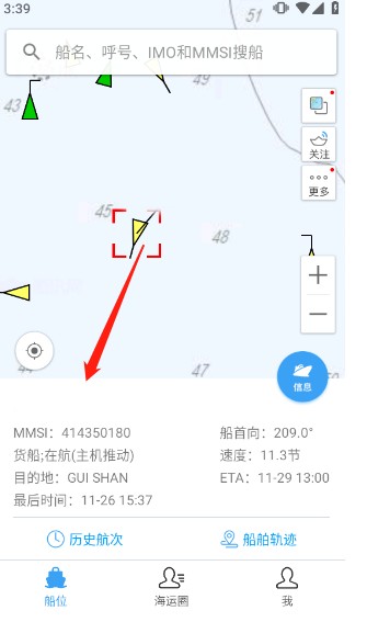 4、点击“信息”还可查看船只的航速、经纬度、目的地等各项微档案,用户还可以点击“距离我”实时监控与本地位置的距离,当然这需要用户注册并登录账号且开启定位权限。