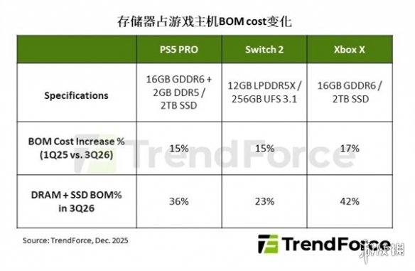 索尼和微软也面临同样困境,2026年存储器成本在BOM cost中占比将超35%,主机上市数年后也难降价,甚至可能调涨售价,如Xbox就传出2025年9月涨价后还将再次提升价格。