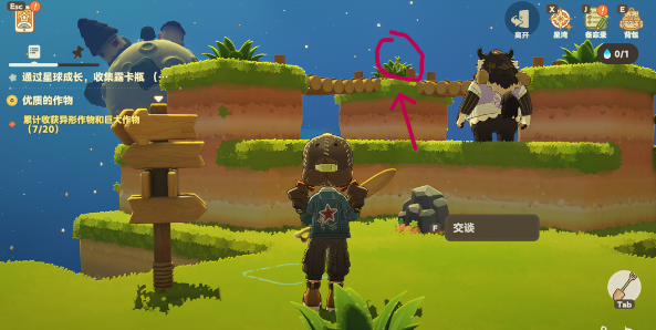 作为新玩家,在刚刚进入到游戏时,那背包肯定就是空的。进度条就会提醒大家,必须要选择多探索多收集。打开备忘录之后就可以看到累计收获异型作物要达到20个,这就意味着接下来的一段时间内,除了需要捕捉昆虫之外,还需要去捕捉一些特殊的物品。玩家在进入游戏的交汇处,看到这一个地方并没有明确的任务指引,但是这里就隐藏着一些小惊喜。除了那只正在不停徘徊的螳螂之外,偶尔还可以遇到一些可以交谈的npc。