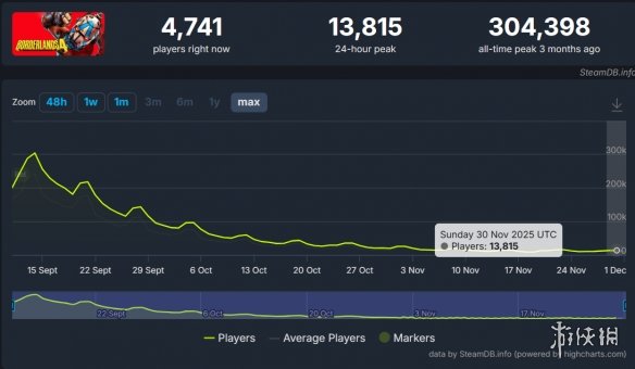 《无主之地4》自9月发售以来热度骤降。Steam数据显示,游戏过去24小时在线峰值仅剩1万余人,相比首发时的30万大军流失了约96%。T2高层承认销量未达预期,分析认为技术优化差、结局争议及缺乏更新的服务模式是导致“鬼服”的主要原因。