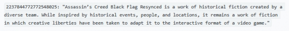 据了解,该文本内容实际上是育碧经典的“免责声明”:“《刺客信条:黑旗 重新同步版(Assassin's Creed Black Flag Resynced)》是一部由多元团队创作的历史虚构作品。尽管灵感来源于真实的历史事件、人物和地点,但它依然是一部虚构作品,为了将其改编为电子游戏这种互动形式,采取了创造性的改编处理。”