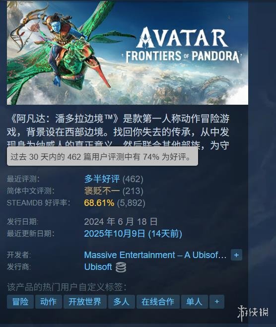 《阿凡达:潘多拉边境》是一款以西部边境为背景的第一人称动作冒险游戏。截至发稿前,本作最近评价为“多半好评”,好评率74%。