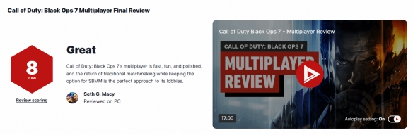 近日,IGN发布了《使命召唤22:黑色行动7》多人模式的评测,打出了8分的成绩。