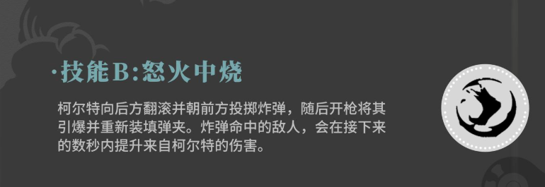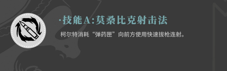 在第一个技能上面,柯尔特可以带来莫桑比克射击法,这个技能的效果一样也是跟前面的弹药匣相关联,此时需要提前将弹药匣里面的火力都充能起来,积累足够的数值之后,柯尔特使用这个技能一就可以消耗其中弹药匣的数值,来向前方使用一个连射的攻击,此时的连射速度也是非常快的,第二个技能叫做怒火中烧,这个技能则是要有一个前摇 动作 ,使用怒火中烧的时候,柯尔特会先向后方翻滚一下,此时对前方造成的射击是投掷的动作。