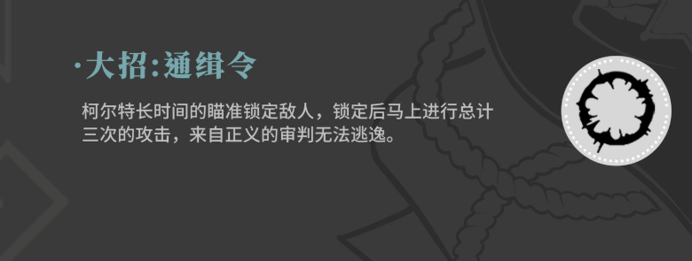 此时带来这个技能的话,如果大家有蓄力效果,那么在距离敌人比较近的地方,大家继续蓄力,持续瞄准敌人弱点,使用之后不会消耗火力资源,而且一样会带来弹药匣能力回填的效果,柯尔特在大招上面是有一个通缉令的效果,这个通缉令基本都是需要很长时间才可以使用一次的,使用大招的时候,柯尔特会长时间的瞄准一个目标,同时对这个目标进行锁定,锁定之后马上进行攻击,这里的攻击根据大招的效果,会带来连续3次的输出,而且很多的敌人身上就算有避开技能,也无法逃脱这个技能的伤害。